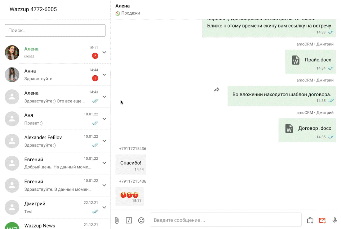 В Wazzup и Pact можно общаться с клиентом не только из сделки. Оба сервиса встроили в CRM свои чаты, в которых есть переписки со всеми клиентами. Поэтому при работе через Wazzup и Pact не нужно скакать по сделкам, когда чатитесь одновременно с несколькими людьми.