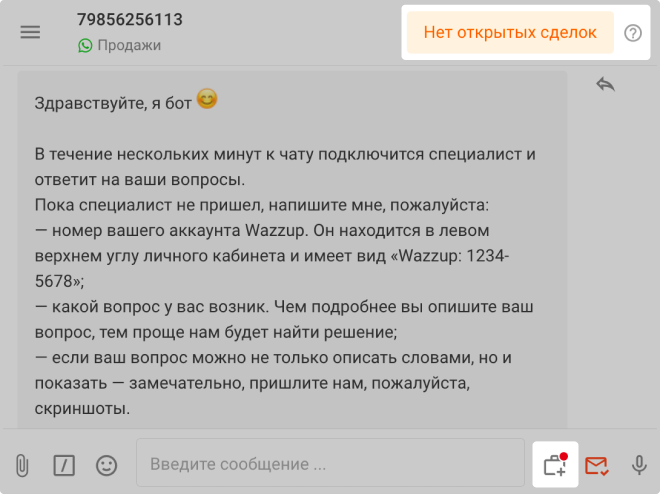 2. Если во время переписки с клиентом продавцу нужно оставить комментарий или задачу в сделке, в Pact придется копировать номер, выходить из чатов и вручную искать нужную. А в чатах Wazzup менеджер может перейти в сделку прямо из диалога кликом по значку чемодана.
