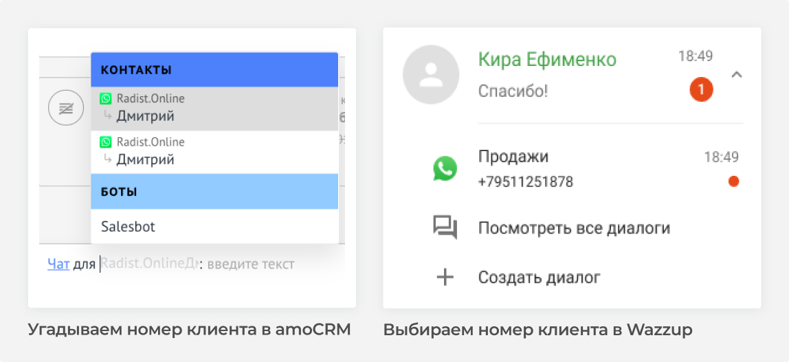В Radist.Online и I2CRM продавцу не видно, с каким номером он переписывается. Если у клиента несколько телефонов, можно лишь догадываться, на какой из них ушло сообщение.
