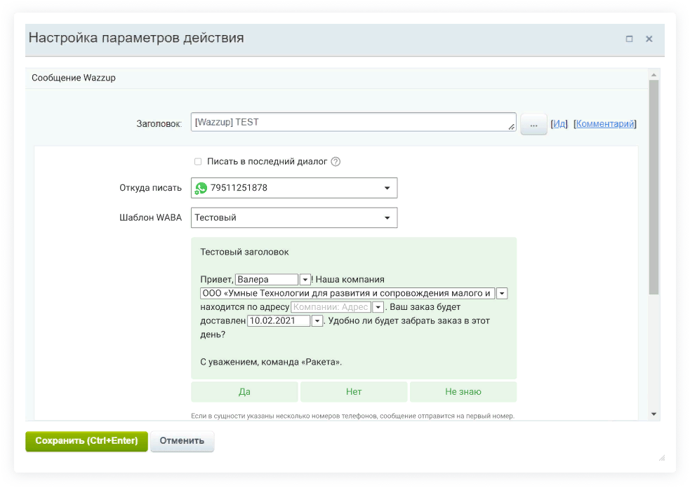 Если элементы интеграции — CRM и мессенджер WhatsApp, то с соответствующего канала можно будет отправить сообщение с текстом и дополнить его не только картинкой, видео или файлом, но и переменной из системы CRM.