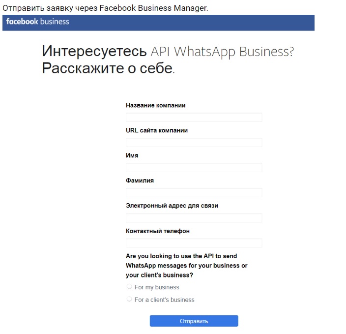 Вам потребуется подать заявку через сервис мессенджер-маркетинга, который вы использовали для подключения к API Ватсапа. При заполнении формы нужно будет указать все публичные сведения о вашей компании: