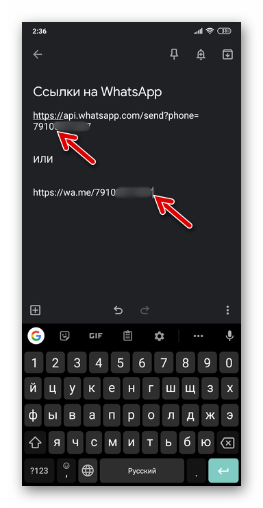 Также можно составить текстовое сообщение с номером получателя. Вид у него будет такой: https://api.whatsapp.com/send?phone=79034954376&text= Буду%20на%20связи%20после%20обеда.