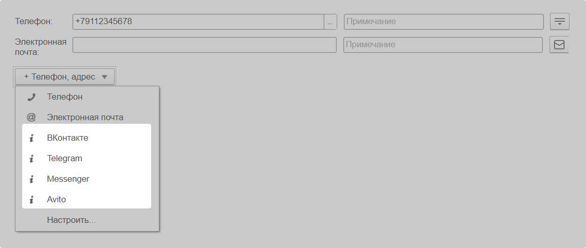 В 1С:УНФ После подключения интеграции у контактов появятся три новых поля в разделе «Адреса, телефоны»: