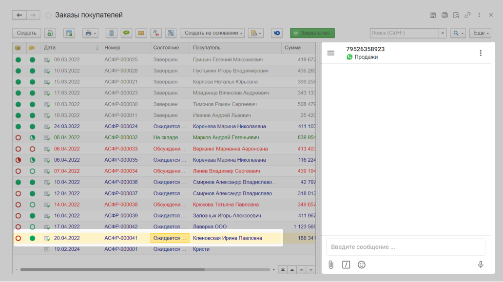 Если открываете чаты из списка — окно с диалогами появится справа. Чтобы переключаться между чатами, выбирайте в списке, с кем или по какому заказу отобразить диалоги. Например, на скриншоте ниже мы зашли в переписку по заказу контрагента Кленовской Ирины. Пока что там пустой чат. Если захотим посмотреть переписку по следующему заказу — надо нажать на следующую строку в списке.