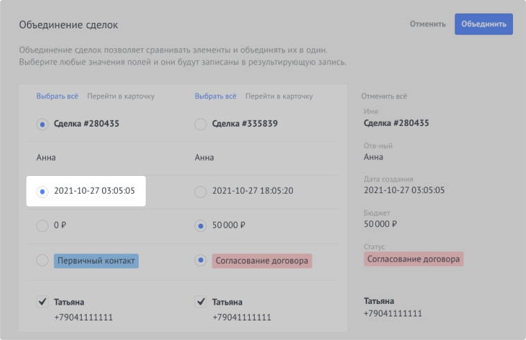 3. Отметьте, какие данные о контакте нужно оставить. Оставьте галочки на всех сделках → нажмите «Объединить».