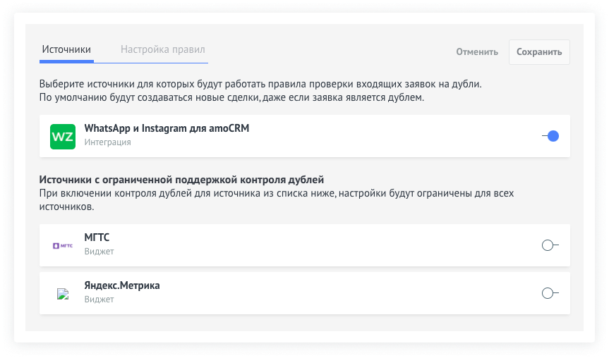 4. В открывшемся окне появятся источники сделки. Найдите в списке «WhatsApp и Instagram для amoCRM» и включите ползунок напротив.