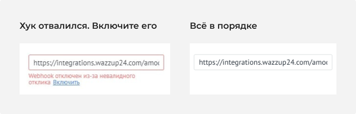 Вебхук — это механизм нотификации о том, что наступило какое-то событие. Например, вам пришло сообщение от клиента. Вебхуки включаются автоматически при создании интеграции, но если произошел какой-то сбой — могут отвалиться. Тогда: