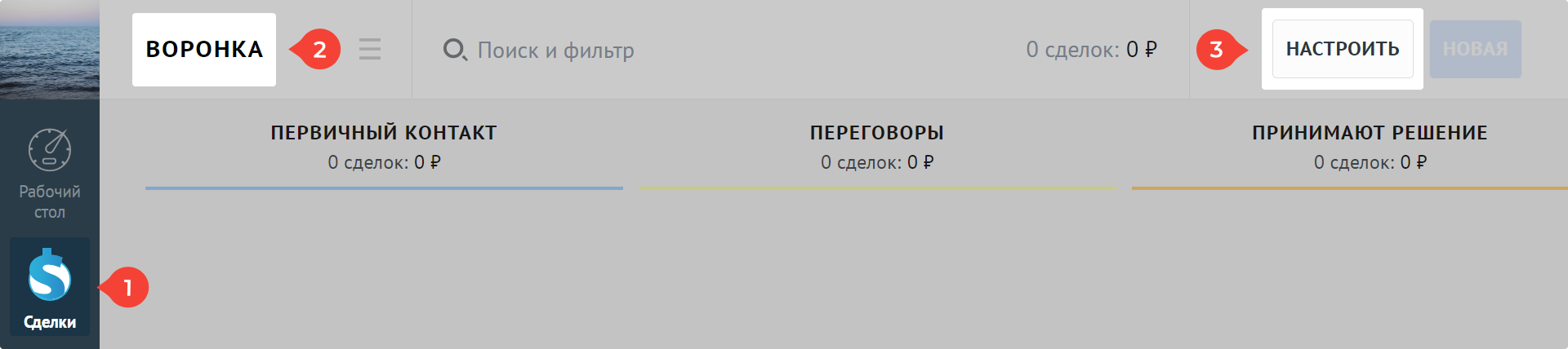 1. Перейдите в раздел «Сделки» → откройте нужную воронку → нажмите в правом верхнем углу «Настроить»