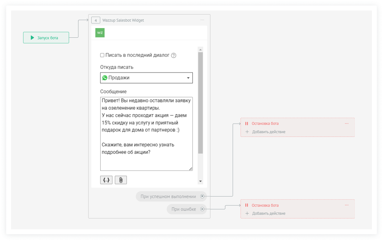 На этом шаге мы делаем так, чтобы после ответа клиента бот выполнял действие, которое нам нужно. Например, переводил сделку на другой этап или создавал задачу менеджеру.
