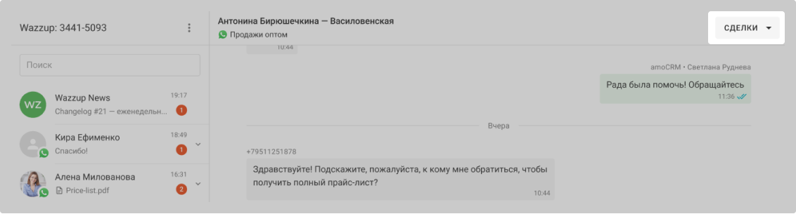 Список «Сделки» — инструмент в окне чата с контактом, который: