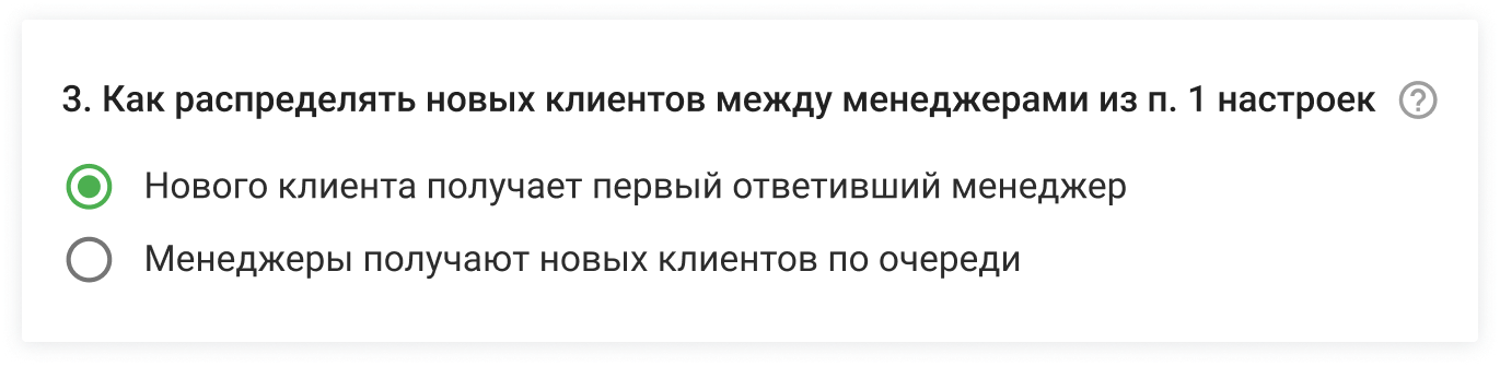 a) Нового клиента получает первый ответивший менеджер — когда напишет новый клиент, все пользователи с ролью “менеджер”, имеющие доступ к диалогам Wazzup (пункт настроек №1) увидят это обращение. Как только один из менеджеров ответит, у остальных этот чат пропадёт. Ответивший станет ответственным в CRM.