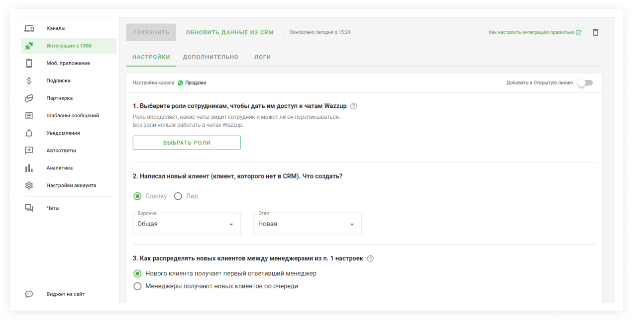 После подключения настройки отображаются во вкладке «Интеграция с CRM». Там мы настраиваем, какие чаты будут видеть продавцы и как клиенты будут распределяться между ними.
