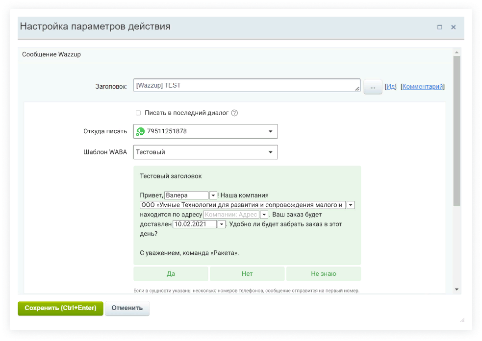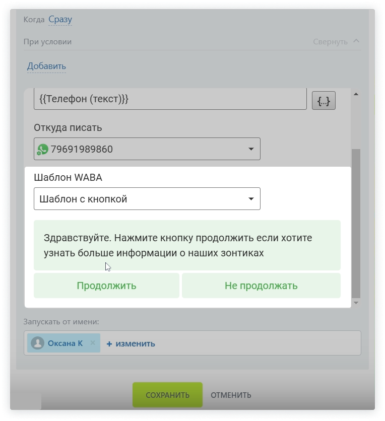 5. В новом окне настройте робота под свои задачи. Тут вы можете выбрать подходящий шаблон WABA из выпадающего списка «Шаблон WABA».