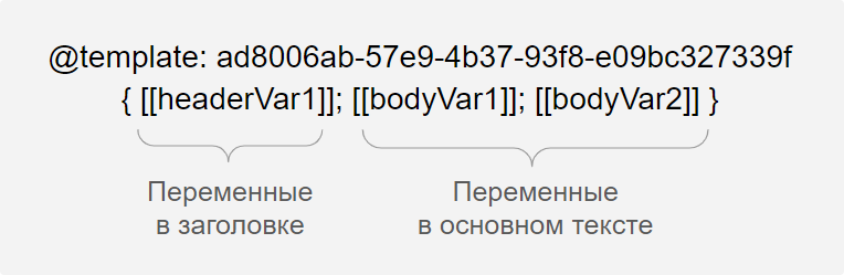 Чтобы заполнить переменную текстом, вместо headerVarN и bodyVarN в скобках напишите необходимый текст. Должно получиться так: [[хороший текст]].
