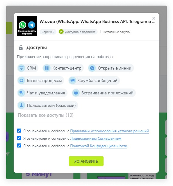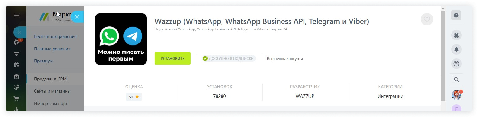 Чтобы подключить интеграцию с Wazzup, вам нужна активная подписка на маркет в Битрикс24. Перед началом настройки убедитесь, что ваша подписка активна. Если у вас возникли вопросы, наша служба поддержки всегда готова помочь.