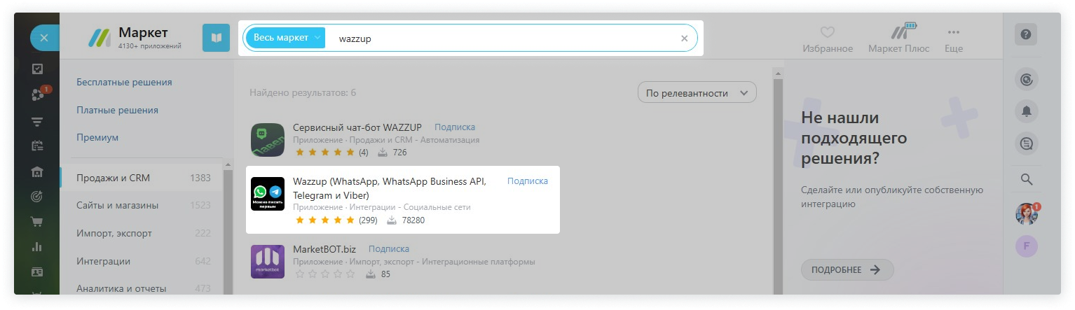 2. В поисковую строку введите название приложения «Wazzup» и выберите Wazzup (WhatsApp, WhatsApp Business API, Telegram, Viber).