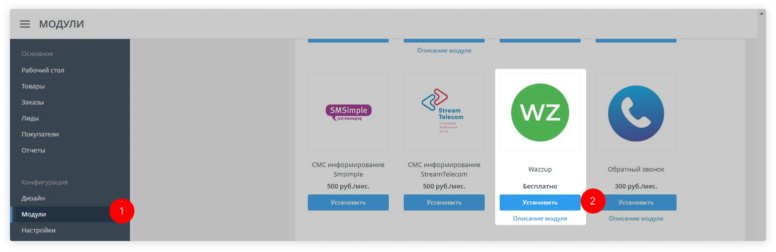 3. В меню справа откройте «Модули» → «Связь с клиентом». Найдите Wazzup → нажмите «Установить».