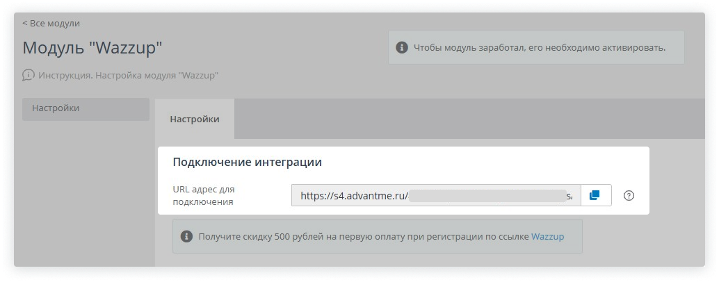 4. Перейдите в «Настройки» Адвантшоп → скопируйте «URL-адрес для подключения» (он должен выглядеть так: домен/WazzupAdminSettings/WazzupConnect).