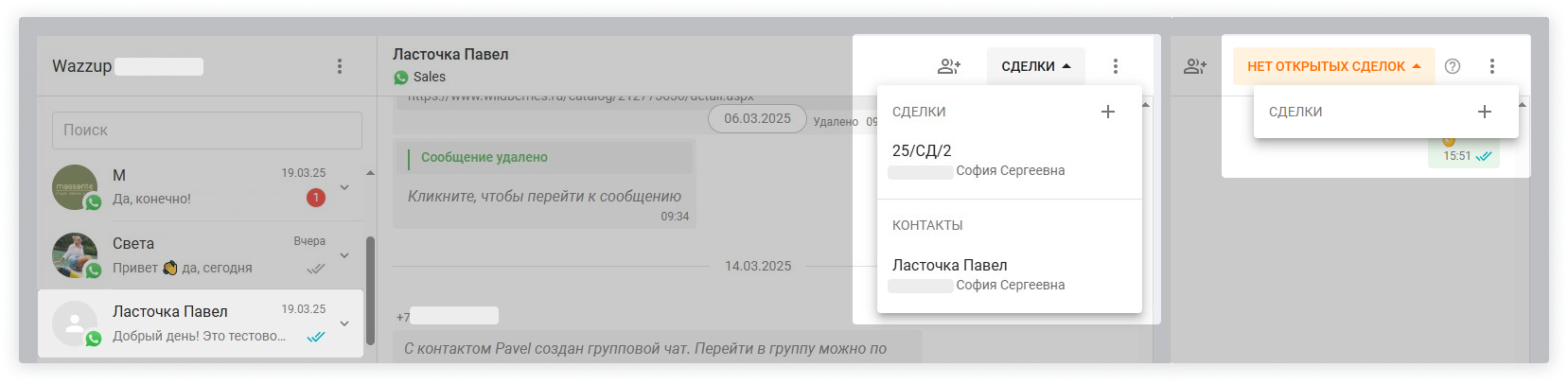 Чтобы создать сделку или перейти в уже существующую, откройте нужный диалог в Wazzup и нажмите на «Сделки», либо на «Нет открытых сделок» → «+ Создать».