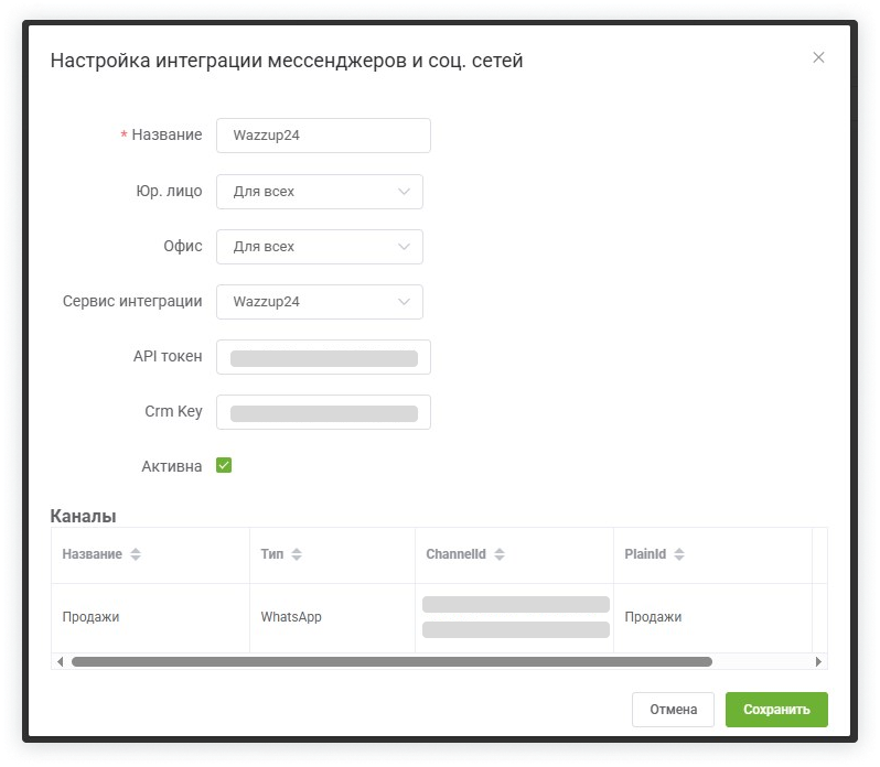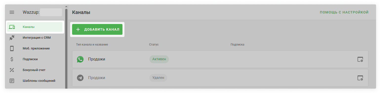 2. В личном кабинете Wazzup в разделе «Каналы» подключите WhatsApp. После подключения все чаты из этого канала появятся в Wazzup, а затем и в CRM.