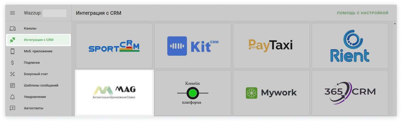 3. Откройте раздел «Интеграции с CRM» и выберите «MAG» → нажмите «Продолжить» → «Подключить».
