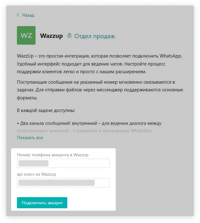4. Введите номер телефона и вставьте API-ключ Wazzup → нажмите «Подключить аккаунт».