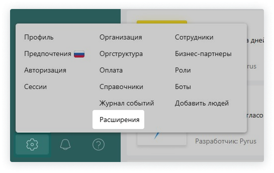 1. Откройте Pyrus → нажмите на шестеренку внизу слева → выберите «Расширения».