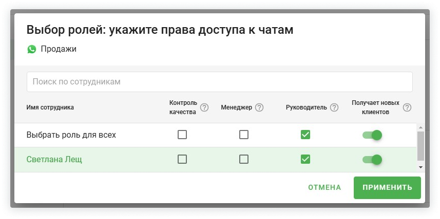 Включите ползунок «Получает новых клиентов» тем сотрудникам, на которых нужно создавать сделки, когда напишут новые клиенты. Нажимаем «Применить» → «Готово».