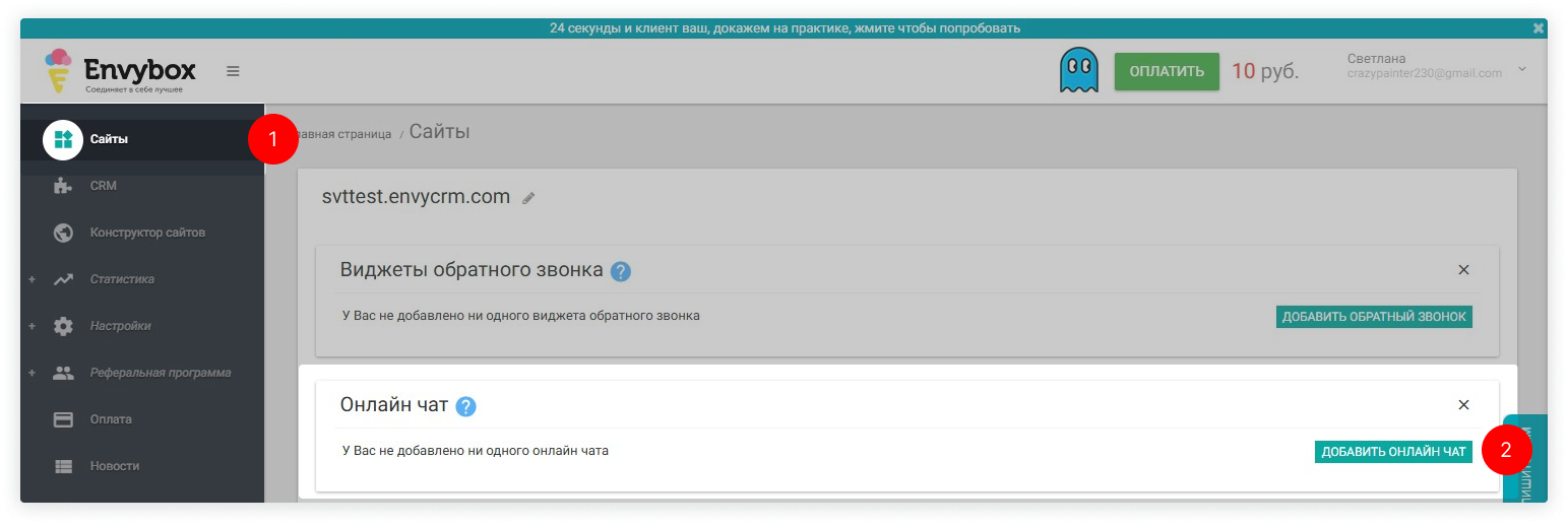 4. Перейдите в кабинет Envybox и слева выберите «Сайты» → найдите «Онлайн чат» и нажмите «Добавить онлайн чат».