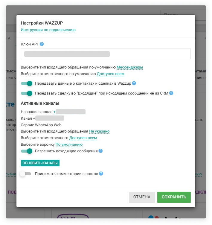 5. Интеграция подключена. Теперь нужно настроить активные каналы и сохранить изменения.