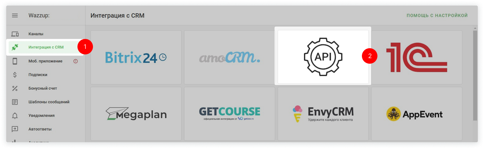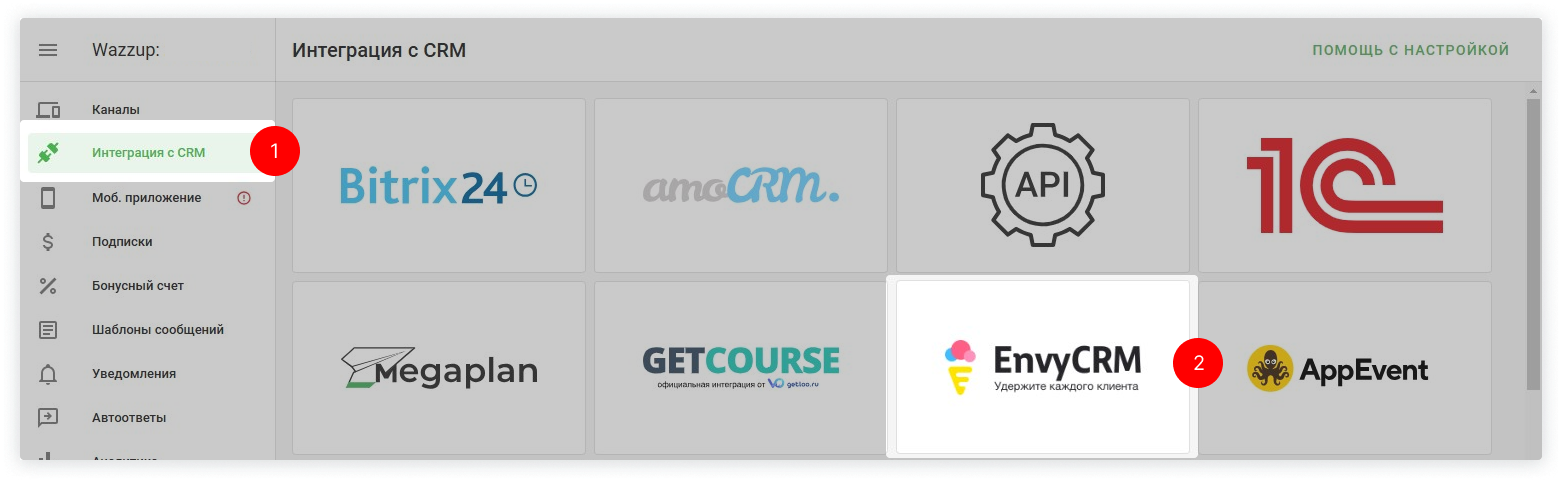 2. В личном кабинете Wazzup выберите вкладку «Интеграция с CRM» → найдите EnvyCRM в списке доступных интеграций → нажмите «Продолжить» → «Подключить».