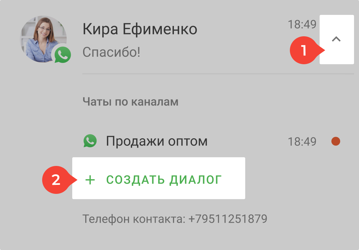 Если у клиента указано несколько номеров, то можно выбрать на какой написать. Для этого нажмите на три полоски рядом с именем клиента → «Создать диалог» → выберите нужный номер и нажмите «Создать».