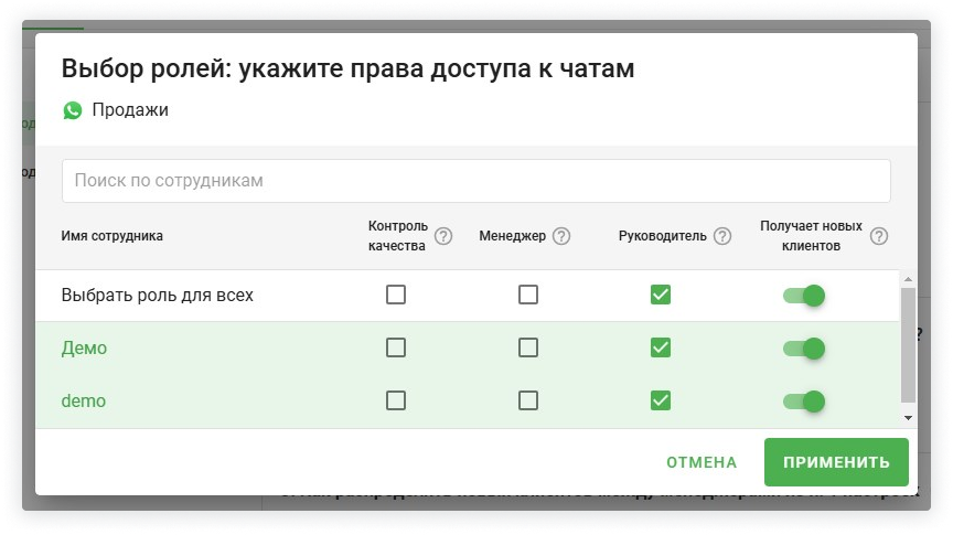 Роль определяет права сотрудника: какие чаты он видит и может ли он переписываться с клиентами. Чтобы назначить роли, нажмите «Выбрать роли» → откроется модальное окно со списком всех сотрудников из CRM.