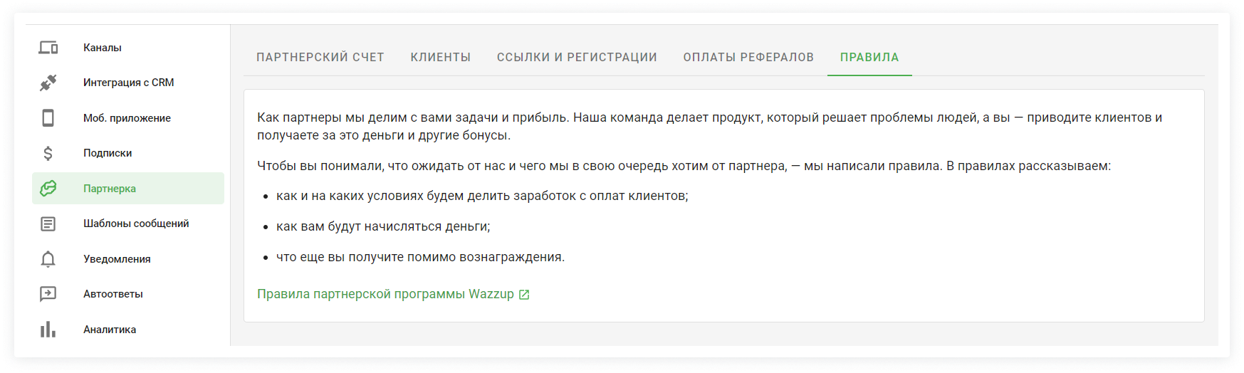 Первое, что советуем сделать в личном кабинете партнера, — прочитать правила партнерки. Они, внезапно, находятся во вкладке «Правила». Там вы узнаете, как будет расти ваше вознаграждение, где получить помощь, как можете влиять на развитие продукта и наши ожидания от партнеров.