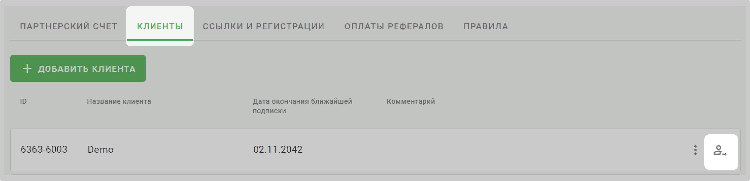 Управлять настройками клиента вы можете из своего личного кабинета. Перейдите во вкладку «Клиенты» → нажмите на «человечка» напротив нужного аккаунта.
