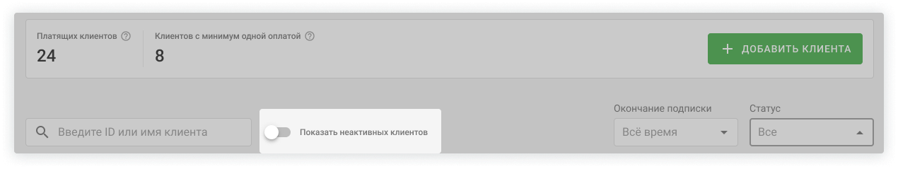 По умолчанию неактивные клиенты в таблице скрыты. Если хотите их увидеть — включите тогглер «Показать неактивных клиентов» в правом верхнем углу таблицы.