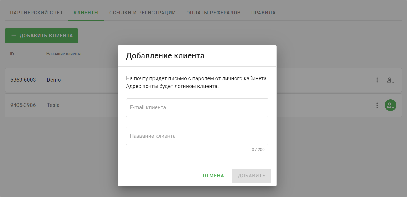 1. Перейдите на вкладку «Клиенты» в партнерском кабинете → нажмите «Добавить клиента».