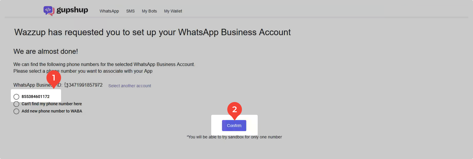 Вкладка автоматически обновится. На экране появится список номеров, которые связаны с аккаунтом WhatsApp Business. Выберите номер, который подключаете → нажмите Confirm → и еще раз Confirm.