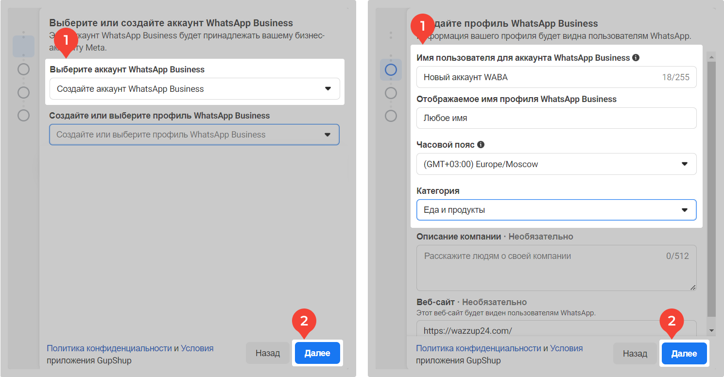 Сайт укажите сразу. А описание компании можно позднее в личном кабинете Wazzup.