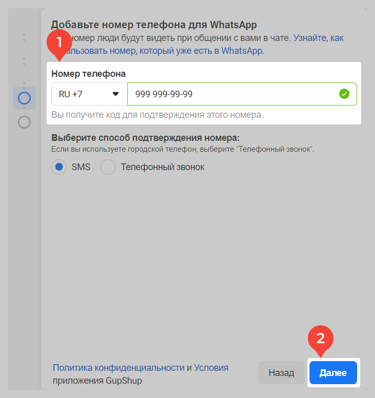 5. Введите нужный номер → подтвердите его → в личном кабинете появится канал WABA с этим номером.