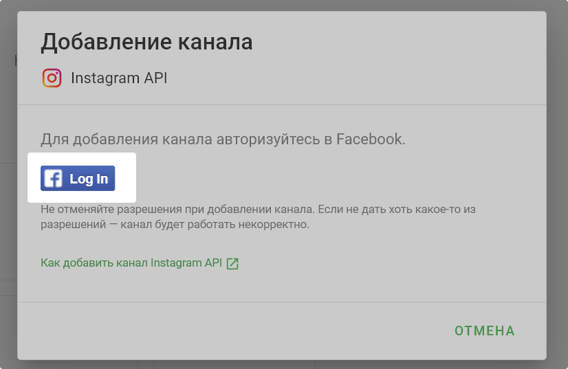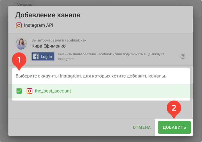 Если вам надо добавить несколько каналов — снова нажмите зеленую кнопку «Добавить канал» и выберите аккаунт для создания канала Instagram API.