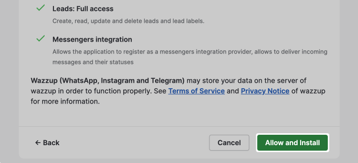 5. Прокрутите вниз экран с разрешениями и кликните Allow and install.