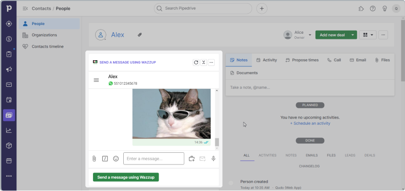 Вы можете переписываться с клиентами из «родных» чатов Pipedrive во вкладке «Обмен сообщениями» или в чатах Wazzup, которые встроены в CRM. Чат Wazzup с клиентом можно открыть из карточки контакта или сделки. Там отобразятся только диалоги с контактами, которые привязаны к карточке.