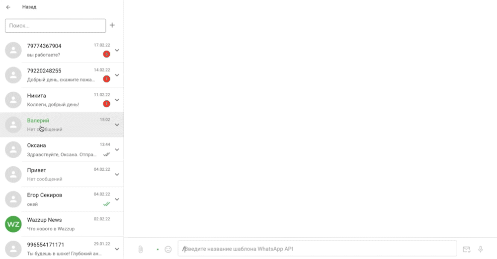 Чтобы отправить шаблон WABA из чата Wazzup, перейдите в диалог и выберите шаблон из списка по кнопке «/».
