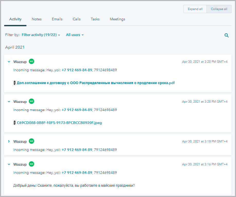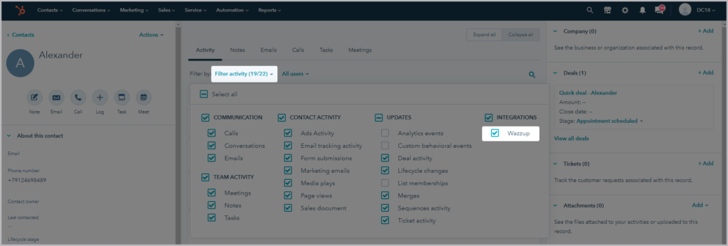 В Hubspot в карточке лида, контакта или сделки откройте окно с фильтрами ленты событий и поставьте галочку напротив Wazzup.