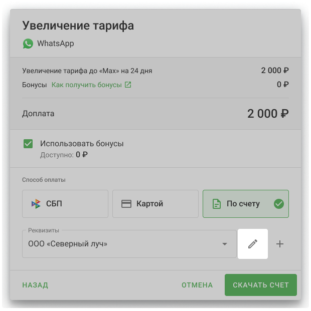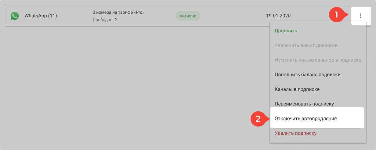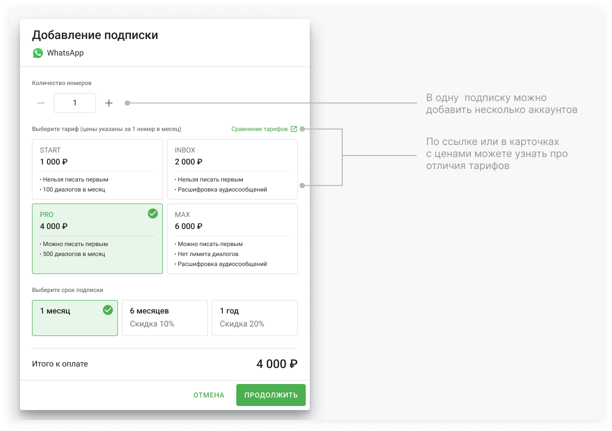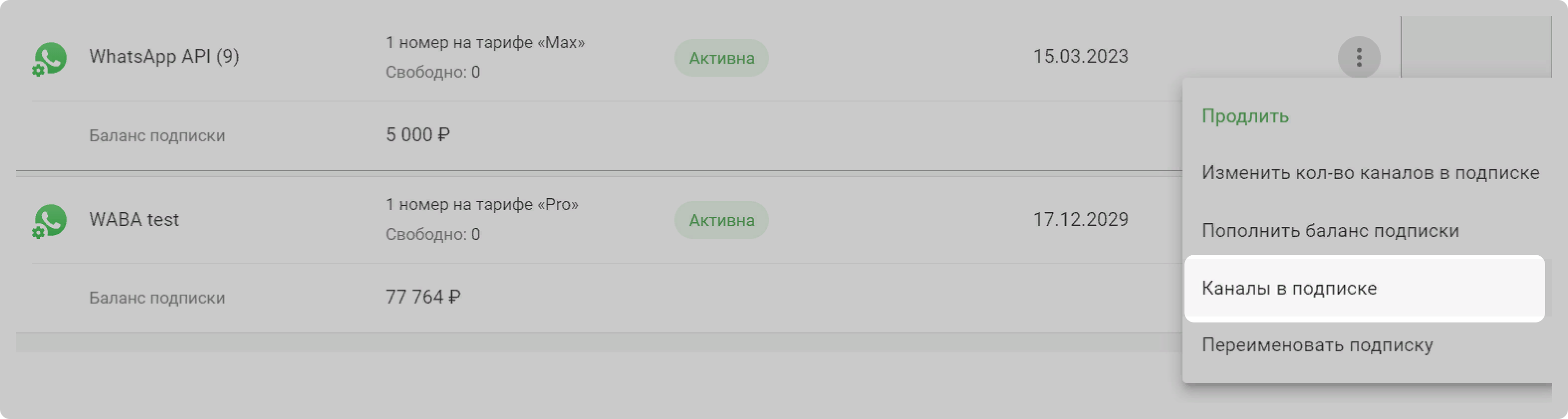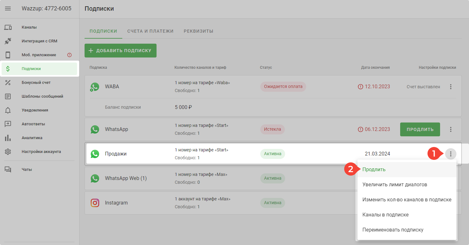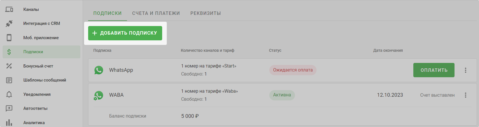 • если вы подключаете WhatsApp Business API (WABA), просто оплатите текущую подписку — создавать новую не нужно.