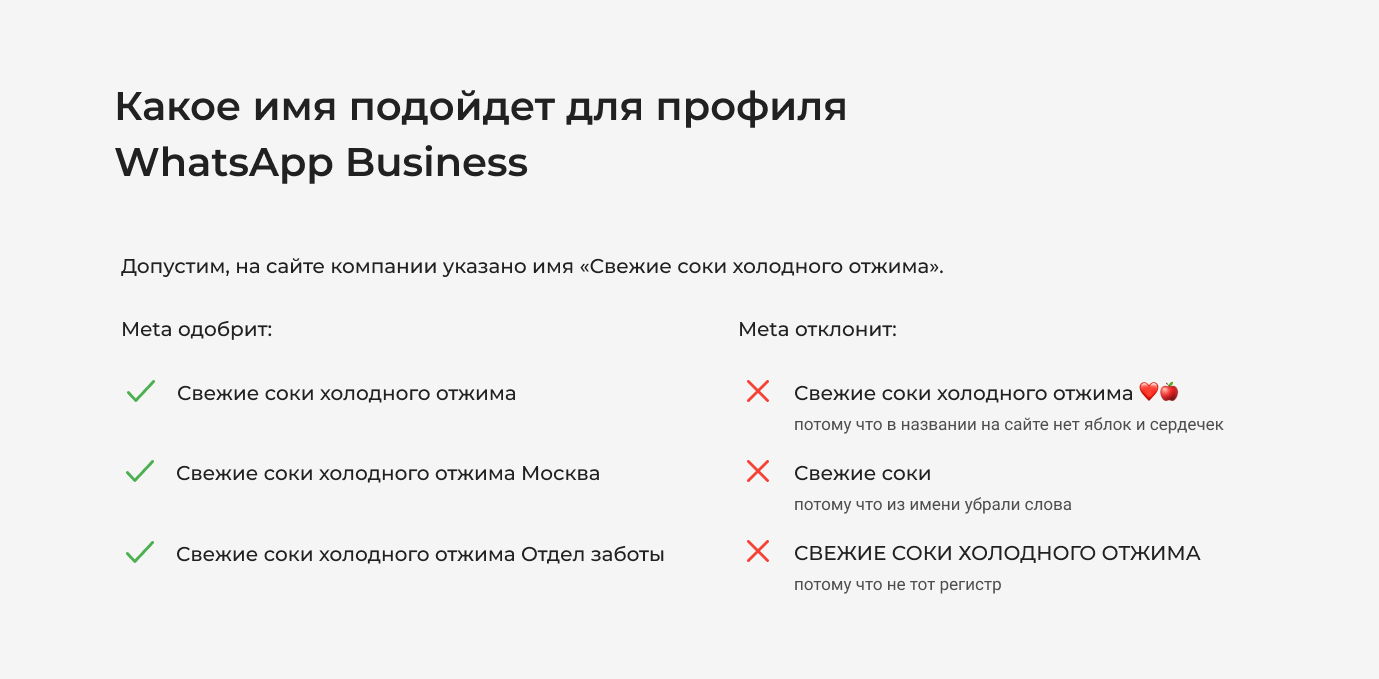 В некоторых случаях в имени профиля не получится указать название вашей компании, потому что Meta не разрешает использовать: