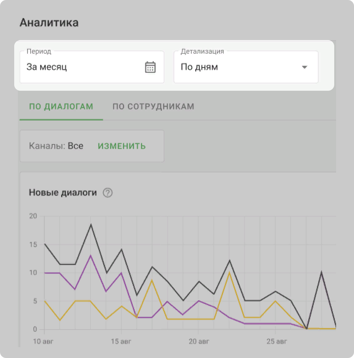 Посмотреть статистику по каналам можно только во вкладке «По диалогам». Для этого нажмите на кнопку «Изменить» на панели «Каналы» и укажите нужные.